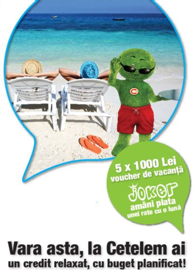 Pentru un credit in valoare de 10 000 lei pe o perioadă de 20 luni, respectiv 21 de luni în cazul utilizarii serviciului Joker, dobânda anuală fixă este de 8.35%, comision lunar de administrare (sumă fixă scadentă și datoratp lunar, inclusp în rată) 22 lei, comision de analiza 0 lei, DAE 13.9%, rata fixă va fi de 559.30 lei, iar valoarea totală platibilă 11186 lei.Credit oferit de Cetelem IFN SA, str.Clucerului nr.78-80, sect. 1, Bucuresti, J40/13611/2002, CUI 15104905. Ofertă valabilă până la 12.07.2013. Regulamentul promoției este disponibil pe www.cetelem.ro .Credit oferit de Cetelem IFN SA pe baza verificării dovezilor de venit, altor înscrisuri solicitate de acesta și transmise de către solicitant, precum și a informațiilor obținute din alte surse în conformitate cu politica sa de risc.Pentru a beneficia de facilitatea Joker (amânarea unei rate cu o lună), vă rugăm să sunati la numerele 021 305 12 00 sau 0750 100 101, de luni până vineri intre orele 09h00-18h00.